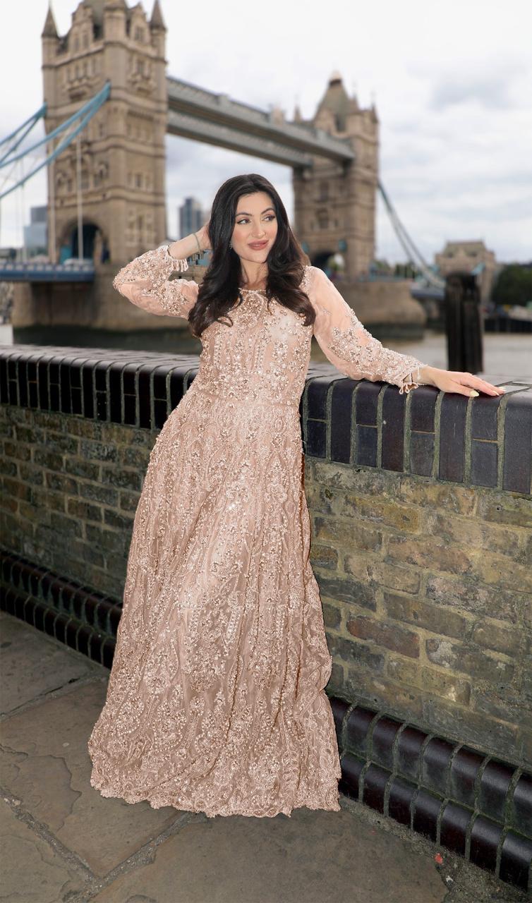 Step into timeless grandeur with this mesmerising creation — rendered in a dazzling champagne-silver hue and adorned with exquisite hand embellishments. The flowing silhouette, draped in rich embroidered organza and layered with intricate craftsmanship, embodies a symphony of elegance and opulence. Perfect for weddings, receptions, and regal festivities, this ensemble is a statement of refinement for the woman who seeks nothing less than perfection.