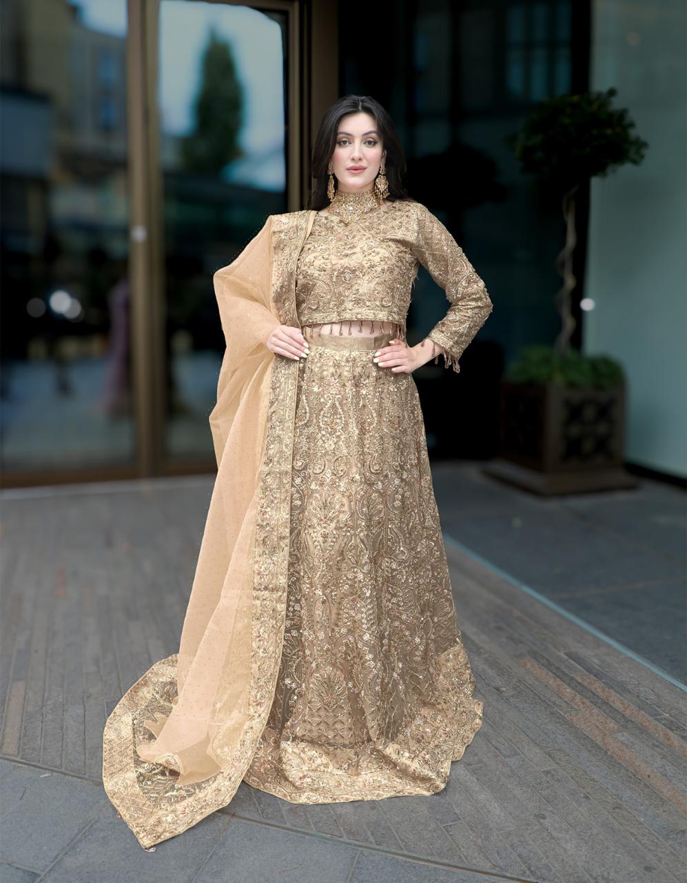 Step into ethereal elegance with this breathtaking masterpiece — a vision in champagne gold organza, lavishly adorned with intricate hand embellishments and shimmering embroidery. The blouse and lehenga panels are intricately detailed, while the flowing silhouette captures the essence of grandeur. A soft blush-pink organza dupatta, illuminated with Swarovski accents and framed with an embroidered border, adds a dreamy contrast of grace. With its refined craftsmanship and luminous charm, this ensemble is a true celebration of beauty, artistry, and timeless luxury.